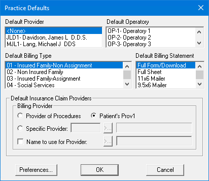 When you enter patient information or perform certain tasks, having to choose a provider or an operatory can be redundant. To save time, you can set a default provider, operatory, billing type, or billing statement for each workstation. You can change practice defaults at any time.