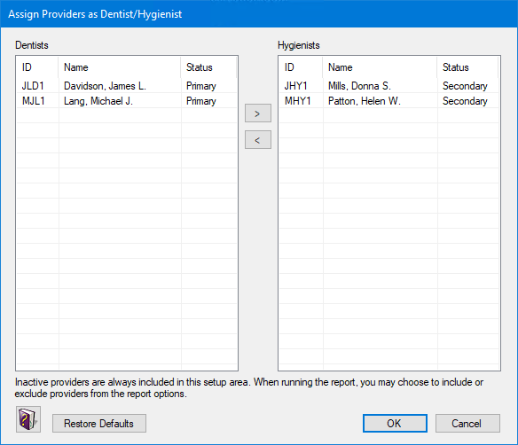 The Dentists and Hygienists list boxes contain the ID, Name, and Status of each provider from the Practice Resource Setup dialog box (For information on how to add and edit provider information, see Practice resource setup). By default, providers (including inactive providers) with a “Primary” Status are assigned to the Dentists list; “Secondary,” to the Hygienists list.