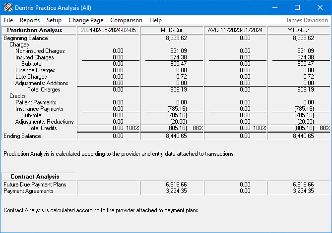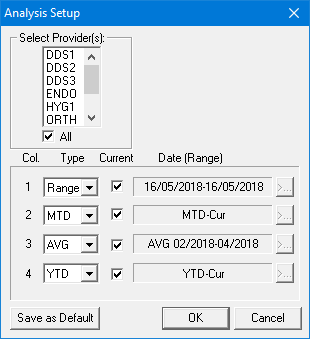 Practice Analysis data display on the Practice Analysis window in four separate columns, based on user-selected providers and date ranges. Also, you can customize each of these columns to display user-defined date ranges.