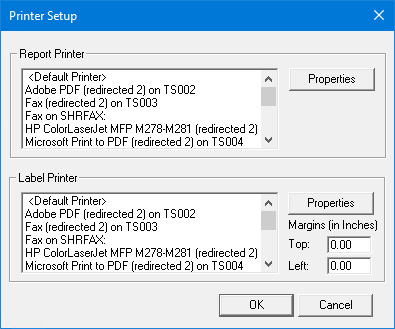 The Printer Setup dialog box appears listing every printer configured for Microsoft Windows.