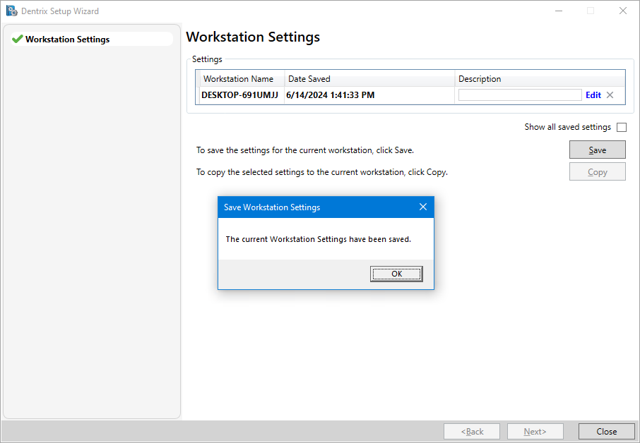 You can use the Dentrix Setup Wizard to save and copy the settings of your practice's workstations. The following workstation settings are saved in the Dentrix Setup Wizard: