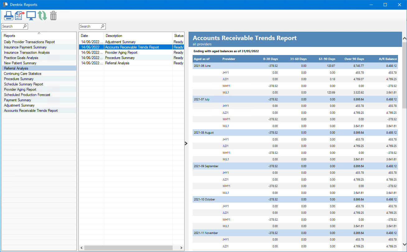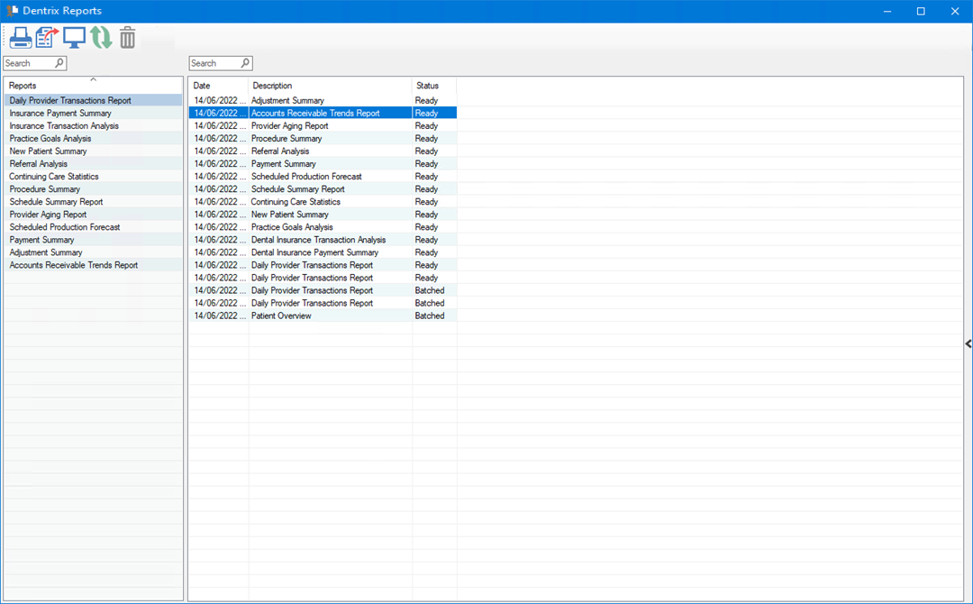 You can print, export, or delete the reports that you run in Dentrix Reports.
