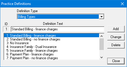 · To change a billing type, select the type that you want to change, replace the description with a new one, and then click Change. To learn more, click Changing a practice definition.