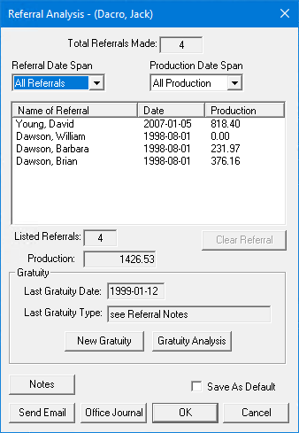From the Office Manager, you can access the same referral analysis information available in the Family File. The Referral Analysis gives you very specific information about the amount of production and the total number of referrals made by a patient in user-defined referral and production time spans.