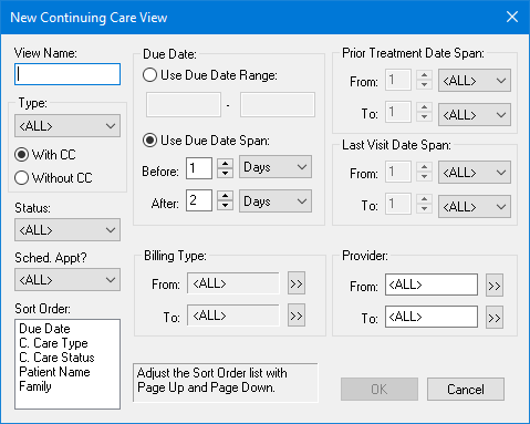 The New Continuing Care View dialog box appears.