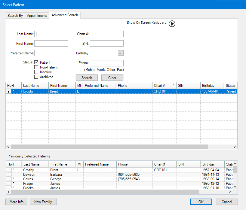 You can search for patients by last name, first name, preferred name, home phone number, chart number, or Social Insurance Number. You can also search for patients you have archived, or you can search patients by appointment date, or you can search by a combination of search parameters, such as last name and birthday or preferred name, Social Insurance Number, and phone number.