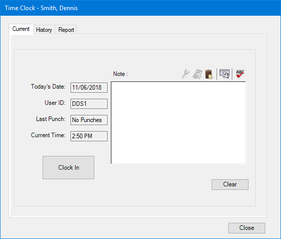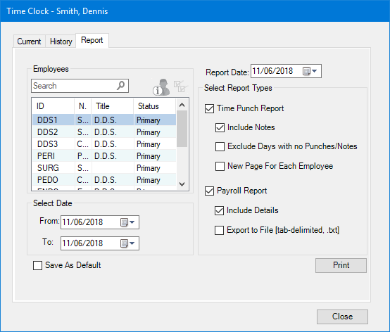 The Report tab in the Time Clock dialog box enables you to print a Time Punch Report and/or a Payroll Report using the employees and options selected. If you enabled passwords, a user must have rights to “Time Clock, Print Payroll Report” and/or “Time Clock, Print Time Punch Report.”