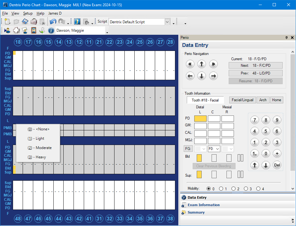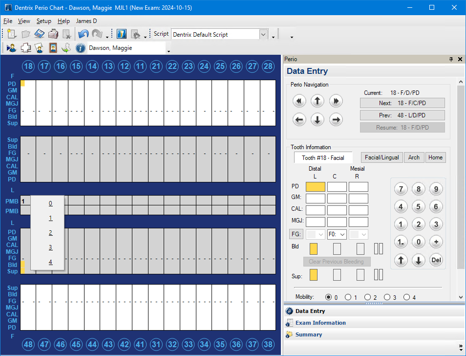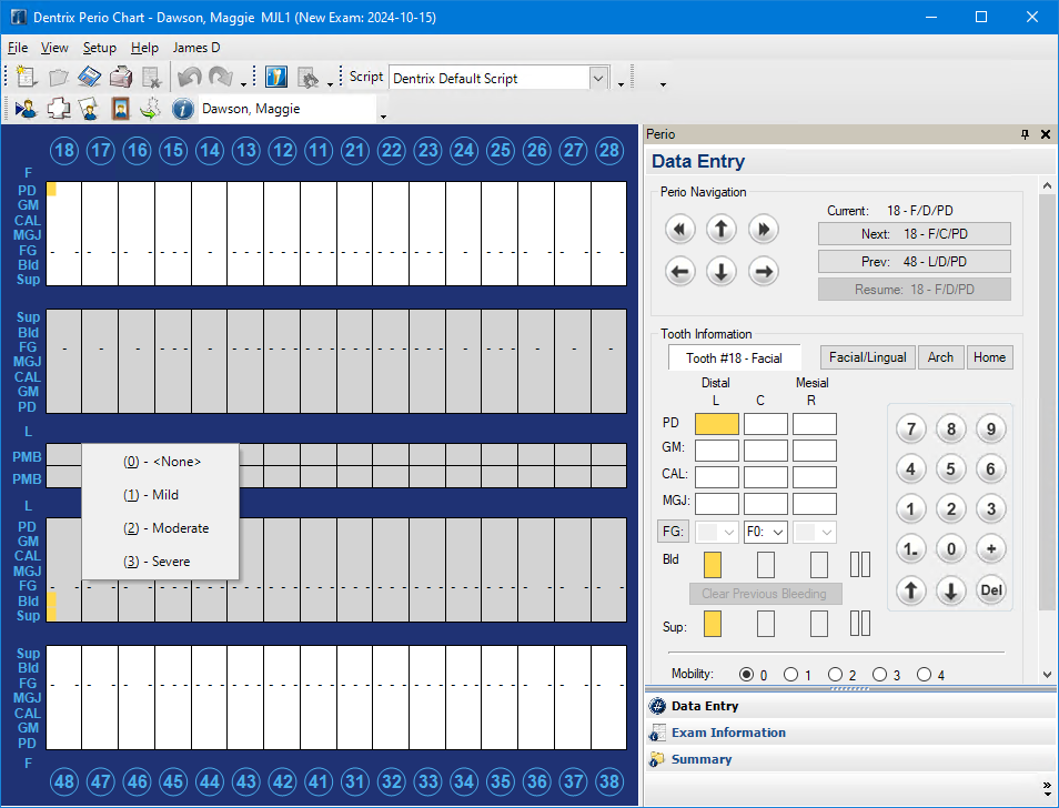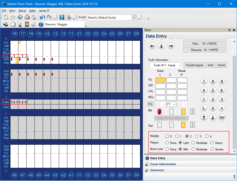 5. To chart plaque and mobility, repeat steps 3 and 4, typing P and M, respectively.