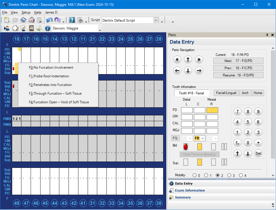 6. To chart the furcation grade, click the upper-right corner of the cell of the desired tooth, and then type the letter F.