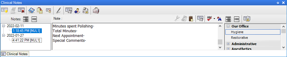 The Clinical Notes panel consists of toolbars, the date and time stamp list, the clinical note text box, and the template list.