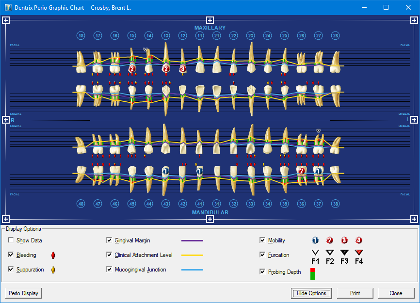The Graphic Chart displays the facial and lingual views of both arches. By default, the entire mouth is displayed. You can view individual arches or quadrants using the zoom buttons