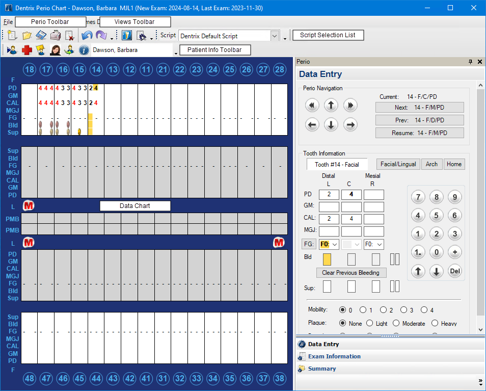 Using the Dentrix Perio Chart, you can record mobility, furcation grades, plaque, calculus, bone loss, pocket depths, bleeding and suppuration points, gingival margins, CAL levels, and MGJ measurements. The Perio Chart also includes automatic calculation formulas that allow you to expedite the charting process by eliminating the need to measure multiple indicators.