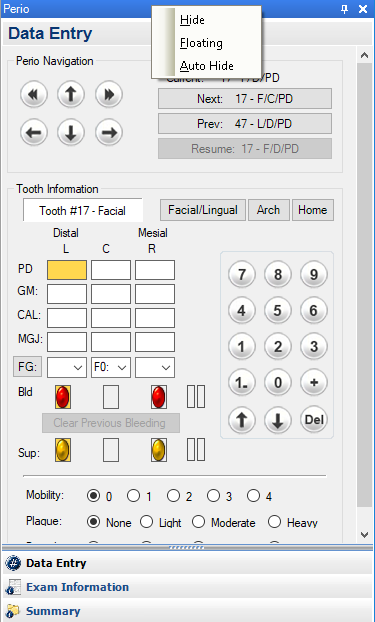 Note: You can also auto-hide the Perio panel. This option allows the Data Chart to expand over the area the Perio panel normally occupies. See Auto-hiding the Perio panel.