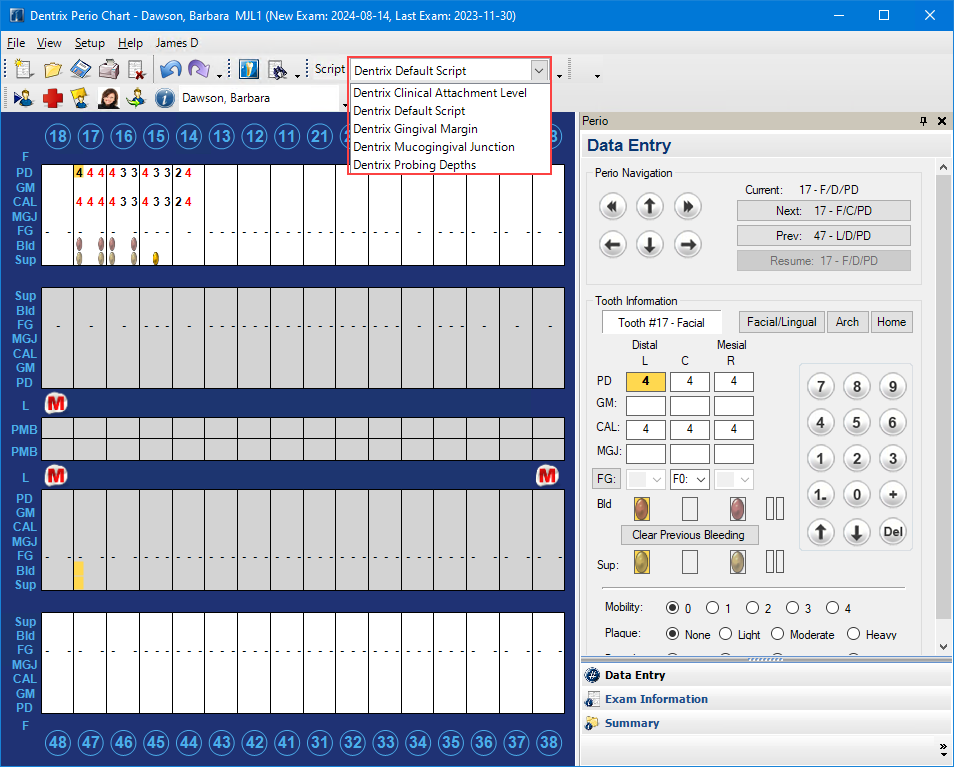 2. In the Script Selection list in the toolbar, select the script that you want to use. For example, to enter probing depths, select Dentrix Default Script or Dentrix Probing Depths.