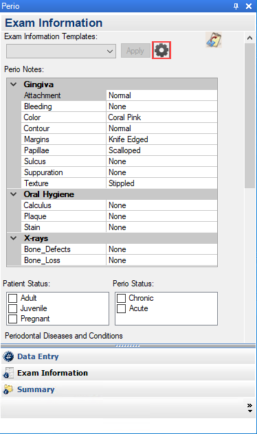 You can set up custom exam templates for periodontal exams. For example, you may want to create templates based on the expected periodontal conditions of certain groups of people, such as tobacco chewers or smokers.