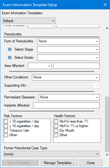The values you set for each exam template will be the default values that appear when you select a template from the Exam Information Templates list. In Dentrix, you have access to the American Academy of Periodontology (AAP) Periodontal Classifications so you can better diagnose and treat periodontitis.