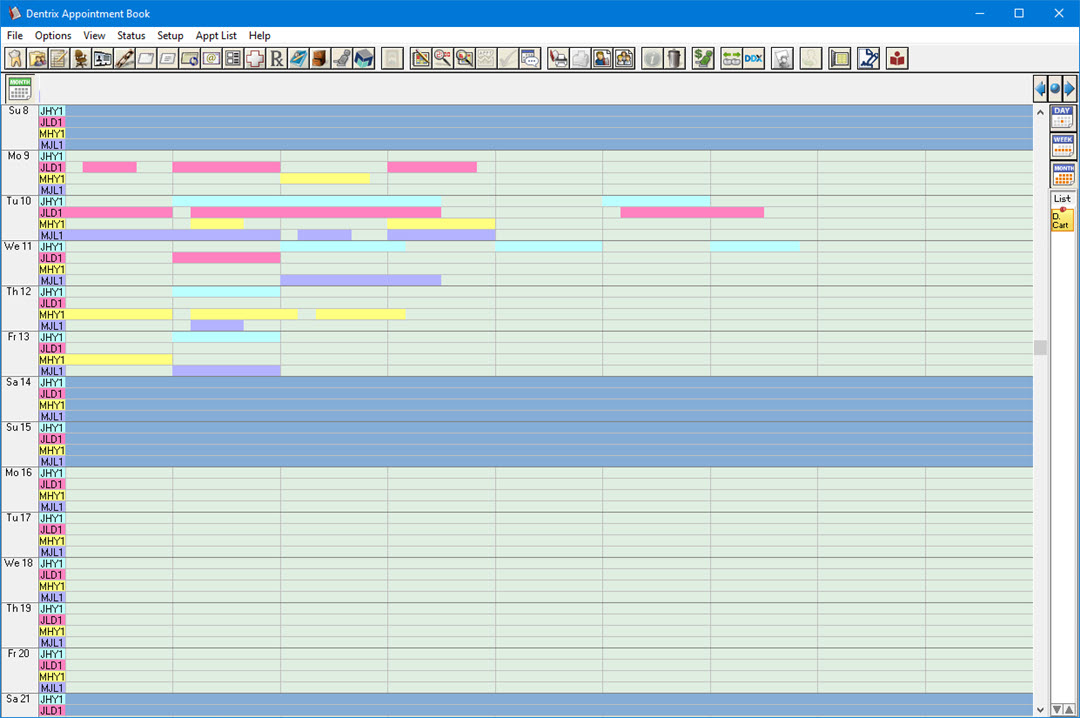 On the left side of the Appointment Book, each provider is listed according to ID colour for each workday in the month. The time of day displays across the top of the Appointment Book instead of in the left and right margins.