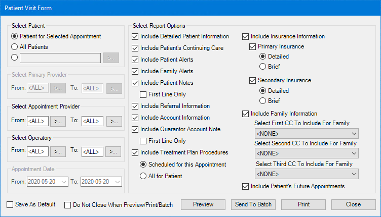 The Patient Visit Form is a route slip that you can customize to view or print for a selected appointment, a certain patient, or multiple patients. You can filter the forms that are generated by primary provider, appointment provider, operatory, and appointment date. The form can include patient, family, account, continuing care, and insurance information; patient and family alerts; patient and account notes; treatment-planned procedures; and future appointments.
