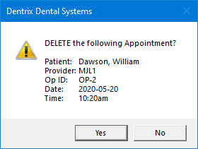 Note: Once you delete an appointment, Dentrix makes an entry to the Dentrix Audit Trail, indicating the date and time you deleted the appointment.
