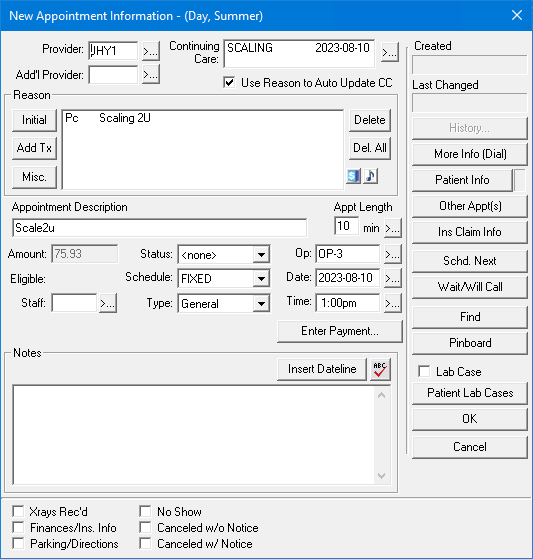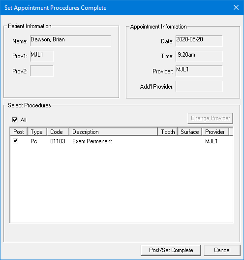 From the Appointment Book, you can set procedures complete, post them to the Ledger, and set the patient's next Continuing Care appointment. If necessary, you can also set procedures complete and post them to the Ledger for more than one provider at a time. To learn more, click Setting procedures complete for additional providers.