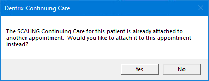 The message below appears if the patient is set up on the continuing care type and the continuing care type is attached to another appointment. Click Yes to attach the continuing care type to the current appointment, or click No to leave the continuing care type attached to the original appointment.