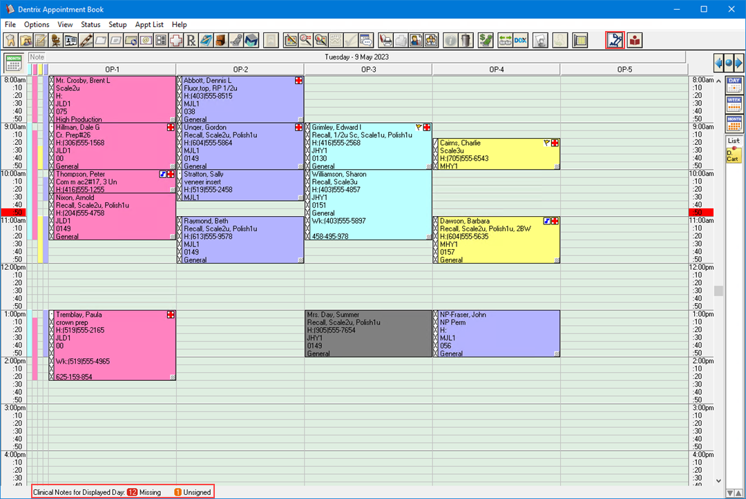 The Clinical Notes count indicator appears in the lower-left corner of the Appointment Book window. The count indicator provides you with the number of the day's missing and unsigned Clinical Notes. The count indicator is hidden automatically when you are viewing future dates. You can toggle the indicator on or off by clicking the Options menu, and then clicking Show Clinical Note Counts. You can open the Signature Manager by clicking the count indicator or the Signature Manager button in the Appointment Book toolbar. To learn more, please refer to "Signature Manager overview."
