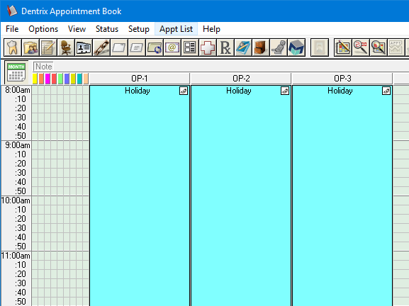 You can schedule an event (a non-patient "appointment") to block out time in the Appointment Book to close an operatory for a day or up to four weeks. Events can include such items as staff meetings, vacation schedules, or holidays.