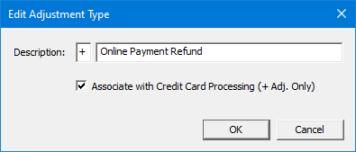 To use this adjustment type for processing credit cards through Axia or Dentrix Enterprise Pay, select the Associate with Credit Card Processing checkbox.