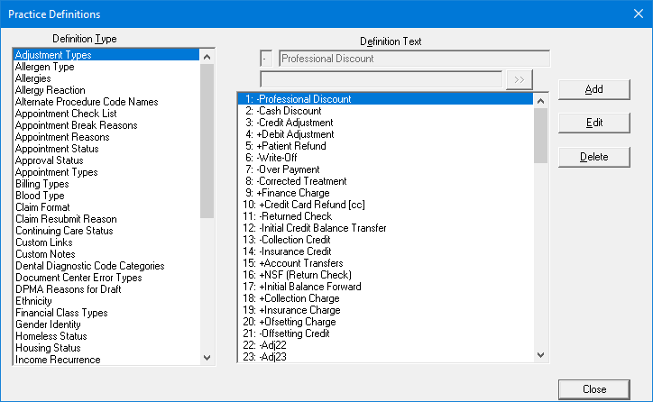 In the Practice Definitions dialog box, in the Definition Type list, select Adjustment Types.