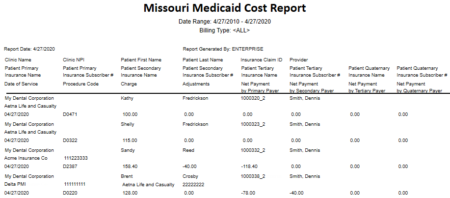The Missouri Medicaid Cost Report displays cost information (charges, adjustments, and net insurance payments) regarding procedures billed to insurance carriers. The report displays only procedures that are associated with dental claims.