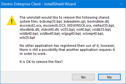 In Apps & features of Windows Settings, select Dentrix Enterprise Client, click Uninstall, and then click Uninstall on the pop-up message.