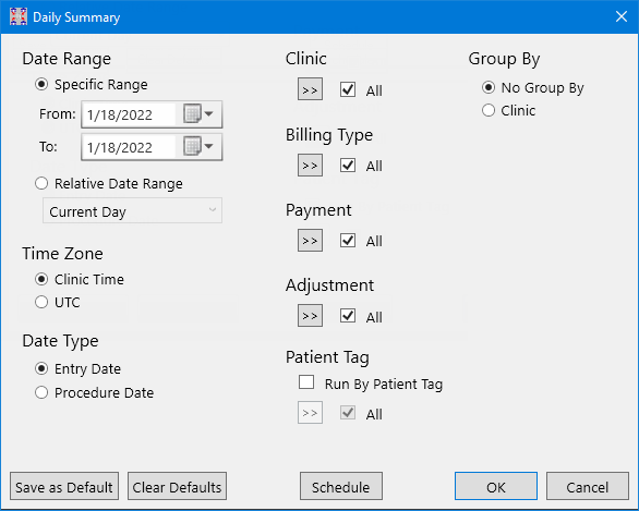 Clinic Time - To use the clinic time zone to determine if a transaction is within the date range for the report.