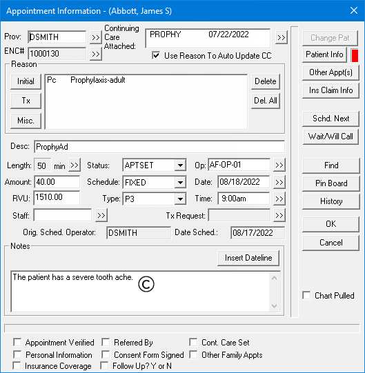 Appointment Notes - The notes that are attached to the patient’s appointment. To access the notes for an appointment, in Appointment Book, double-click an appointment tile.