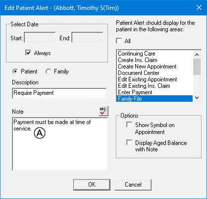 Patient Alert Notes - The patient alerts that are assigned to the patient. To access the notes for a patient alert, in Family File, click the Patient Alerts button, and then double-click a patient alert.