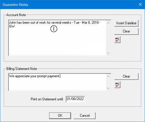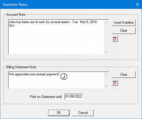 Guarantor Statement Note - The billing statement note that is attached to the patient's guarantor. To access the billing statement note, in Ledger, click the Guarantor Notes button.