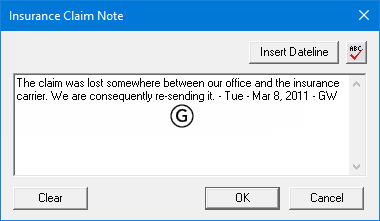 Insurance Claim Notes - The notes that are attached to the patient's insurance claim. To access the notes for a claim, in Ledger, double-click an insurance claim, and then click Note on the menu bar.