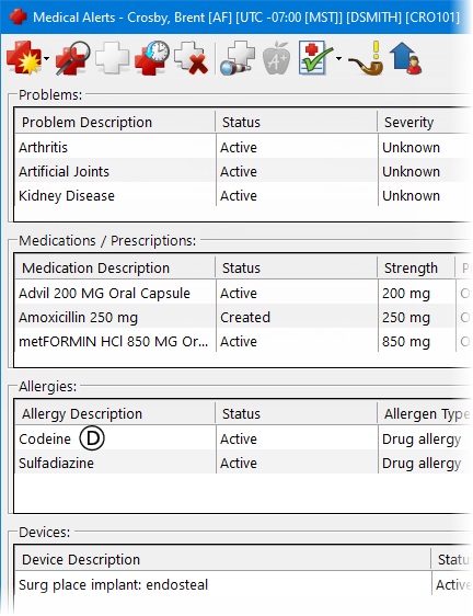 Medical Alerts - The descriptions of problems, medications/prescriptions, allergies, and devices that are attached to the patient. To access medical alerts, in Family File, double-click the Medical Alerts block.