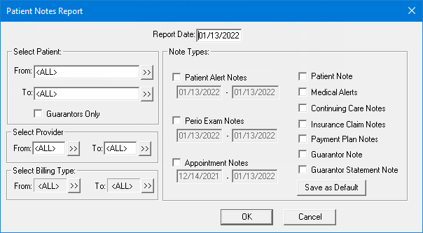 The Patient Notes Report displays any notes you have entered for a patient. You can indicate which patients to print based on name, provider, or billing type, and you can select which types of notes to include.