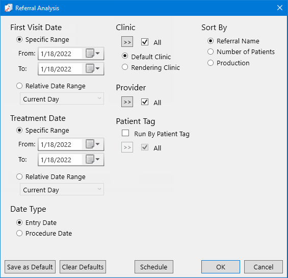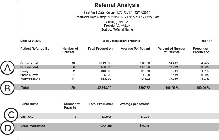 The Referral Analysis report displays the number of referrals from each referral source. The report also displays the amount of production generated as a result of the referrals. Use this report to analyze the effectiveness of your advertising dollars by running a single report.
