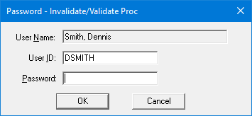 In the Password - Invalidate/Validate Proc dialog box, the overriding user enters his or her credentials in the User ID and Password boxes and then clicks OK.