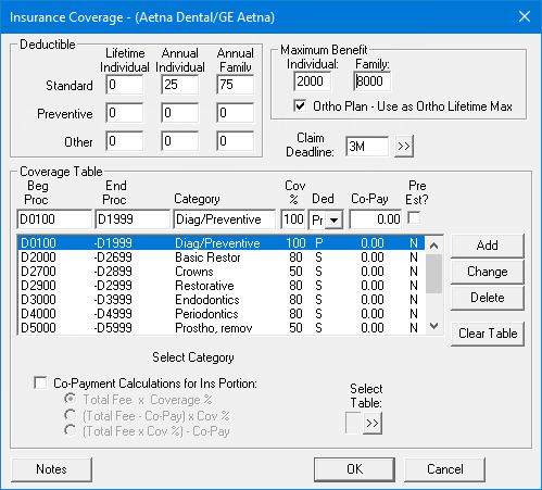 Most insurance companies provide the patient with a schedule of benefits, which declares the maximum annual benefits for the individual and entire family. The schedule of benefits also states the deductible amounts, plan maximums, and the percentage of the usual and customary fee that the insurance company will pay. You can add this information to an insurance plan as a coverage table. You can also specify the deadline for submitting any claim and select the applicable method to calculate insurance co-payments. A coverage table helps you create treatment plan estimates that accurately reflect the benefits that an insurance carrier will pay.