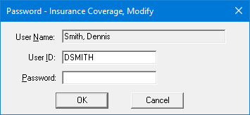 In the Password - Insurance Coverage, Modify dialog box, the overriding user enters his or her credentials in the User ID and Password boxes and then clicks OK.