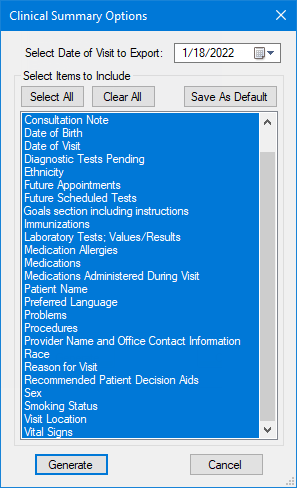 If you are exporting a clinical summary, the Clinical Summary Options dialog box appears.