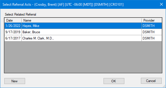 If the correct referral does not appear in the list, to add a referral, click New. The Patient Referrals dialog box appears so you can manage the patient's referrals. When you are finished adding a referral, return to the Select Referral Acts dialog box.