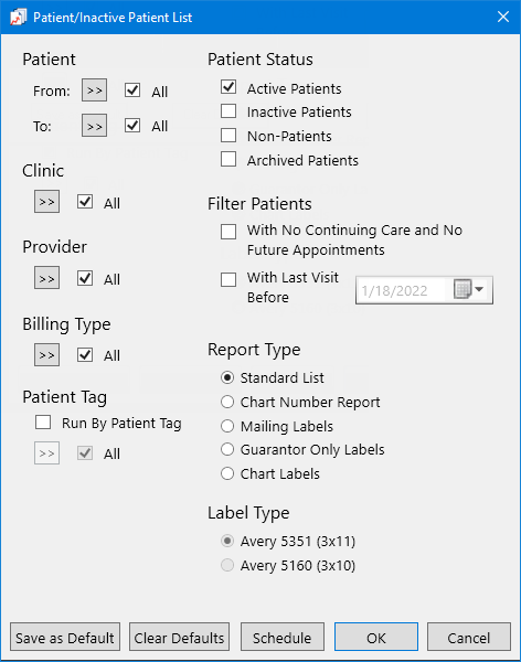 Mailing Labels - To generate mailing labels with each patient’s name and address. With this option selected, you must specify a label type.