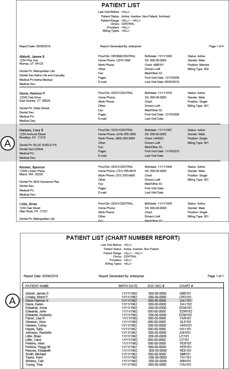 Patient Details - The Patient List (Chart Number Report) displays the name, birth date, Social Security Number, and chart number of each patient. The Patient List (Standard List) includes all of the information covered by the Patient List (Chart Number Report) and general patient information (such as addresses, phone numbers, and insurance information).