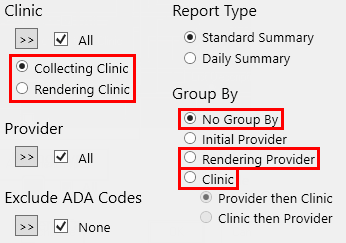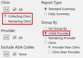 When the report uses the Initial Provider grouping option: The Collecting Clinic and Rendering Clinic options are not available. The report uses the Collecting Clinic for credits and the Rendering Clinic for charges. |