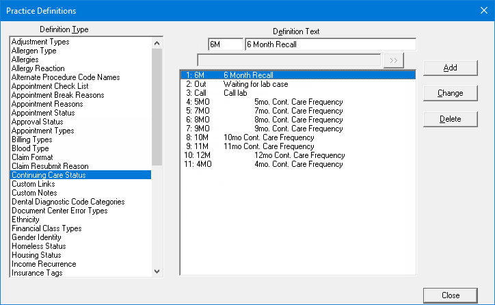 In the Practice Definitions dialog box, in the Definition Type list, select Continuing Care Status.