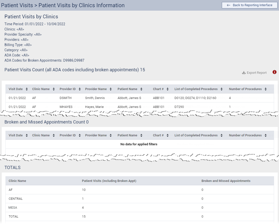Click the name of the summary tile to open the Patient Visits by Clinics Information page and view details of each visit that is included in the calculation for the specified clinics. The Patient Visits by Clinics Information page also displays the visit and broken/missed appointment totals for each clinic. To return to the Resources page, click Back to Reporting Interface.