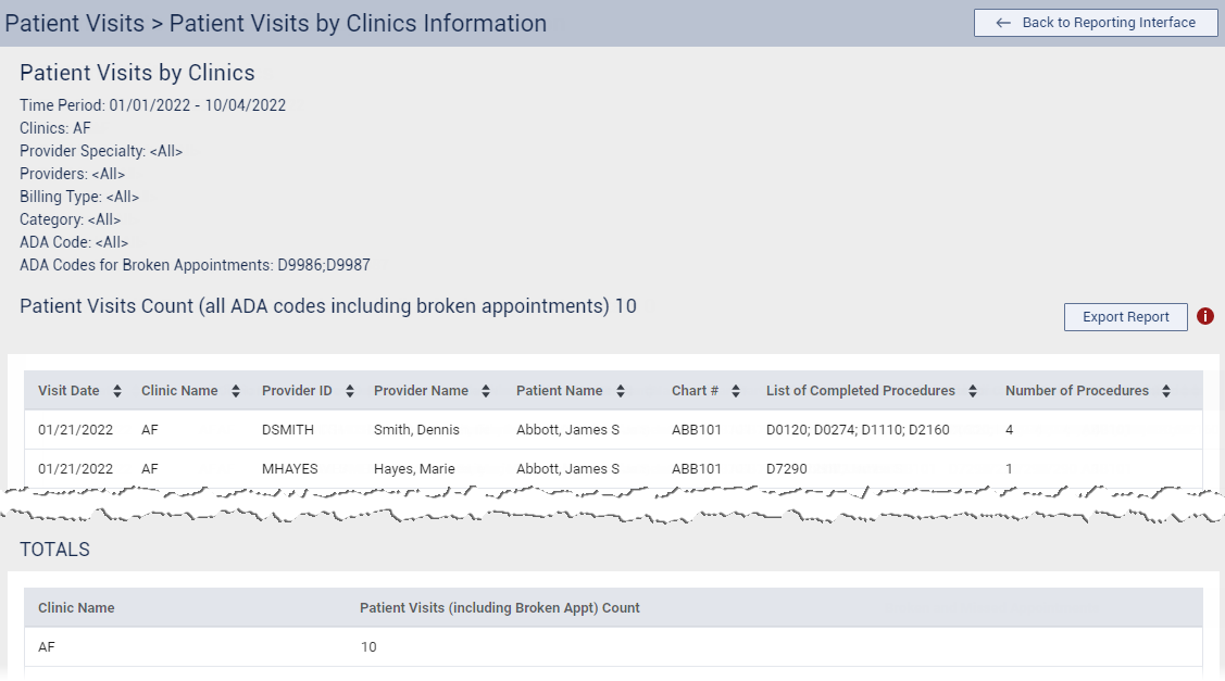 Click a visit or broken appointment on the summary tile to open the Patient Visits by Clinics Information page and view details of each visit that is included in the calculation for that clinic. The Patient Visits by Clinics Information page also displays the total number of visits for the clinic. To return to the Resources page, click Back to Reporting Interface.
